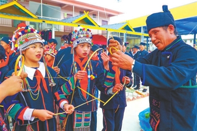 在長(zhǎng)期的實(shí)踐摸索和專家的指導(dǎo)下,學(xué)校決定從增強(qiáng)學(xué)生對(duì)傳統(tǒng)文化的認(rèn)同上打開(kāi)突破口。教師們一起去找寨子里傳承手工藝的老人聊天、學(xué)習(xí),盡可能地把傳統(tǒng)習(xí)俗和文化融入音樂(lè)、美術(shù)、體育教學(xué)。“孩子們認(rèn)識(shí)到了傳統(tǒng)文化的優(yōu)勢(shì)和價(jià)值,自信心就起來(lái)了。”李冬梅說(shuō)。