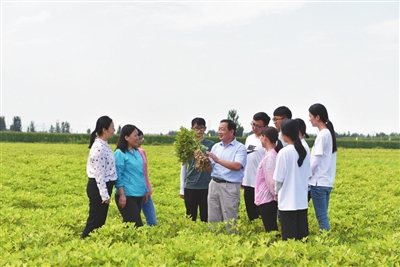 ③國家科技進步獎二等獎獲得者、山東農業大學花生育種專家萬勇善教授在田間與團隊成員查看花生新品種生長狀況。學校供圖