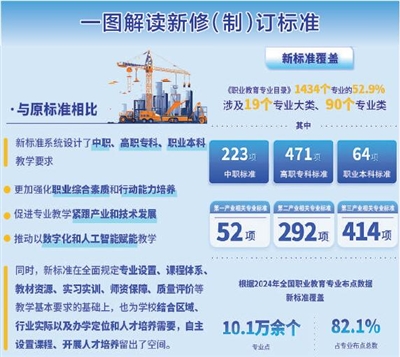 新標準覆蓋《職業教育專業目錄》1434個專業的52.9%,涉及19個專業大類、90個專業類。其中,中職標準223項,高職專科標準471項,職業本科標準64項;第一產業相關專業標準52項,第二產業相關專業標準292項,第三產業相關專業標準414項。根據2024年全國職業教育專業布點數據,新標準覆蓋10.1萬余個專業點,占專業布點總數的82.1%。