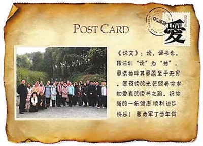 從2014年寒假我帶著15個學生第一次到先鋒書店購書讀書開始,到后來參加人員從經典夜讀小組學生擴展到啟明星讀書社骨干,人數越來越多,轟轟烈烈,成了我們的讀書節日,一晃到今年已經走過了11年。我喜歡把自己與學生在先鋒書店門口的合影做成電子賀卡,在大年初一發給學生。2014年的賀卡,我寫下了這樣一段話,表達我對學生的祝福:“愿愛知求真的燃燈者精神,傳遞開來,傳遞下去,照亮所有的人!祝大家快樂進步!——你們的老曹。”而2017年的賀卡,我寫下另一段話,表達對學生的鼓勵:“《說文》:讀,誦書也。段注訓‘讀’為‘抽’,意謂抽繹其意蘊至于無窮。愿夜讀的光芒照亮你求知愛真的讀書之路。祝你新的一年健康、順利、進步、快樂!曹勇軍丁酉年賀。”