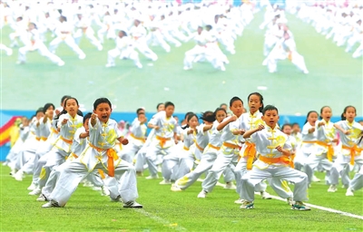 ②北京市中小學(xué)生武術(shù)健身操比賽上,參賽學(xué)生一展風采。 北京教育融媒體中心 供圖