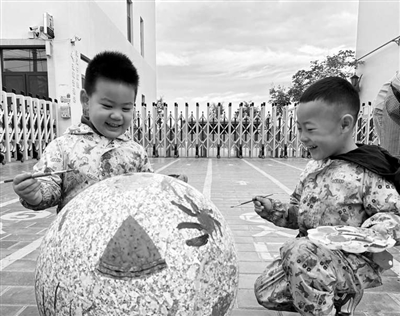 陜西省榆林市定邊縣第四幼兒園的孩子們在石礅上創作。路燕 攝