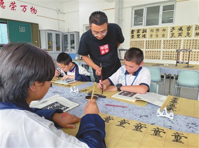 ③新疆生產(chǎn)建設(shè)兵團(tuán)第三師五十一團(tuán)第一中學(xué)的書(shū)法教師在指導(dǎo)學(xué)生學(xué)書(shū)法。蔣夫爾 攝
