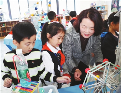 高金鳳(右)在中國兒童號科創博物館聽孩子講設計創意。 學校供圖