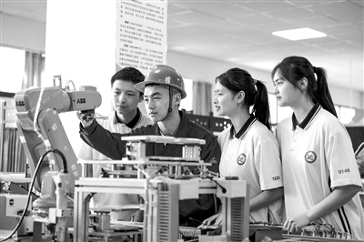①湖南省長沙市電子工業學校學生在學習操作機電一體化設備。 資料圖片