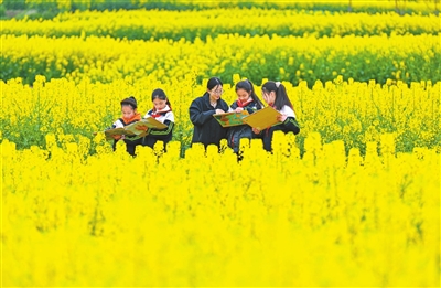 3月13日,四川省眉山市仁壽縣慈航鎮小學校師生來到油菜基地進行田間寫生,用畫筆描繪多彩春光,感受春日的美好。潘建勇 攝