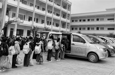 每周五下午,接學生回家的農村客運車輛停放在學校操場指定位置。教師有序組織寄宿制學生到各村指定位置等待,班主任、值日教師配合客運司機清點人數及監管學生安全,引導學生有序排隊坐車,直至學生全部離校。