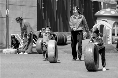 近日,福建省福州市鼓樓區水部街道博仕堡幼兒園,老師正在照護3歲以下幼兒進行滾輪胎游戲活動。