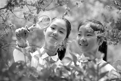 4月9日,江蘇省徐州市植物園內(nèi),徐州市鼓樓生態(tài)園小學學生在觀察植物。