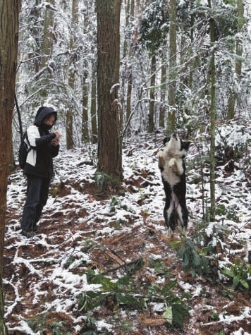 今年3月底,湯振洋在記錄林地數據,第一次見雪的小狗異常興奮。李健 攝