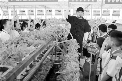 近日,安徽省六安市裕安區(qū)紫荊小學(xué)四年級370余名學(xué)生走進六安市豐泰勞動教育實踐基地,通過基質(zhì)栽培等體驗課程和勞動實踐,感受勞動之美。圖為該校學(xué)生在勞動教育實踐基地了解蔬菜水培的奧秘。