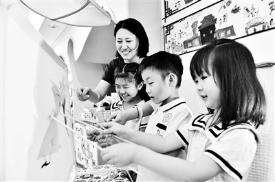 教師和幼兒用皮影講故事。 幼兒園供圖
