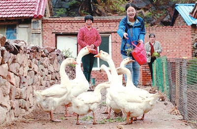 ? 蘇乙桐到姑姑家了解庭院經濟發展情況時,給大鵝投喂青草。