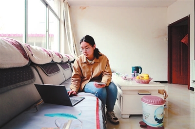 ? 蘇乙桐在家里通過視頻連線的方式了解柳家臺村豐泰農業合作社的水稻育秧情況。