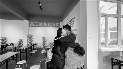 在安丘市實(shí)驗(yàn)中學(xué)家長(zhǎng)接待室,學(xué)生熱情擁抱媽媽和弟弟。 安丘市教體局供圖