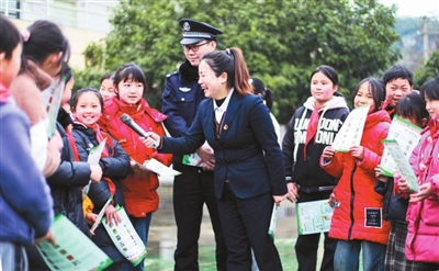 圖片②:在貴州省黔西市鐘山鎮(zhèn)銀龍小學(xué),民警和司法工作人員給孩子們講解法治知識(shí)。 周訓(xùn)超 攝