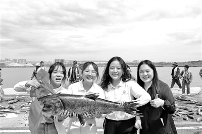 近日,中國石油大學(北京)克拉瑪依校區舉辦捕魚節,為畢業生送上一份特殊的禮物。圖為學生與捕撈上來的“魚王”合影。學校供圖