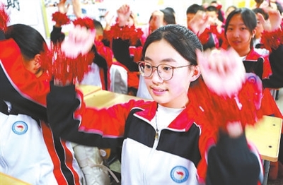 秦皇島市第七中學(xué)學(xué)生在課間參加課桌舞活動(dòng)。