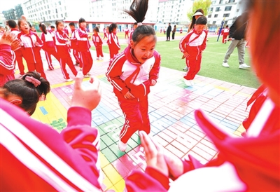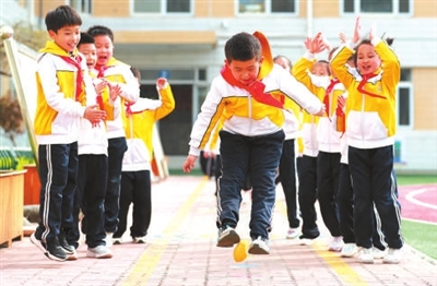在學(xué)校精心設(shè)計(jì)的活動(dòng)場地上,臨河里小學(xué)學(xué)生開心地玩著自創(chuàng)游戲“飛足逗金豆”。