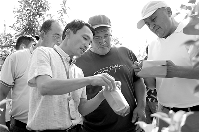 6月16日,培訓班學員在位于陜西省渭南市白水縣的西北農林科技大學蘋果試驗站了解蘋果套袋知識。