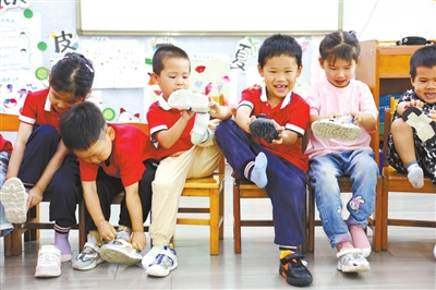 日前,浙江省諸暨市暨南街道街亭幼兒園開展了一場別開生面的幼兒自理能力比賽活動,孩子們通過穿鞋子、折疊被子、整理書本等形式,展示和提升自己的生活技能。圖為孩子們比賽穿鞋子。陳霞芳 攝