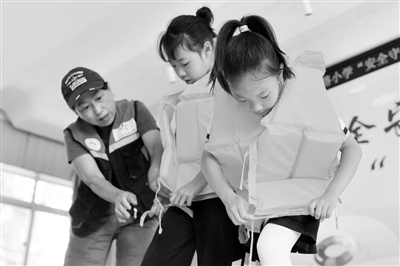 7月4日,在山東省青島市市北區宜陽路小學暑期休業式上,學生們在體驗正確穿戴救生衣。通訊員 王海濱 攝