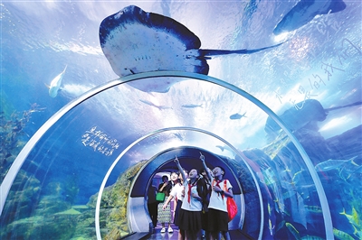 近日,山東省青島市市北區(qū)東勝路小學的孩子們在“海底隧道”觀賞蝠鲼等海洋魚類。暑假期間,孩子們走進青島海底世界展區(qū),通過與海洋動物近距離接觸、觀賞生物標本等過程,學習海洋知識,充實假期生活。 王海濱 攝