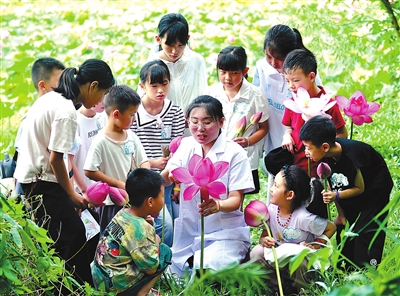 近日,四川省綿陽市梓潼縣自強鎮黎明村荷花園,鎮中心衛生院中醫藥師為自強小學學生講解荷花的觀賞、食用性和藥用性價值。夏日荷花盛開,當地開展“‘荷’其有趣 中醫科普”暑期研學活動,讓學生感受“荷花”藥食同源的功能和中醫藥文化的博大精深。 成和平 攝
