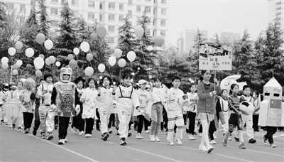 山東省臨沂樸園小學(xué)讀書節(jié)開幕式上,四年級(jí)“科普讀物”方隊(duì)入場(chǎng)。 學(xué)校供圖