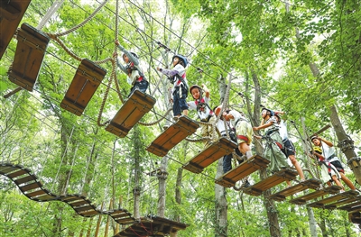 正值暑期,孩子們?cè)谟H近自然中鍛煉身心,收獲成長與快樂。圖為7月26日,孩子們?cè)诮K連云港市楓樹灣叢林樂園體驗(yàn)空中探險(xiǎn)。新華社發(fā)