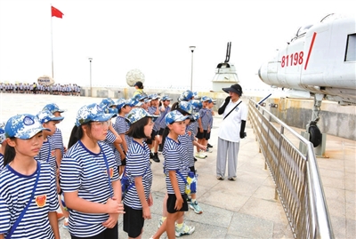 7月30日,研學營的營員們在青島海洋軍事展覽館內參觀?!鞍艘弧苯ㄜ姽潄砼R之際,青島海洋軍事展覽館迎來了由全國各地中小學生組成的海軍研學營。營員們走訪愛國主義教育基地、參觀退役軍事裝備、聆聽英雄故事,在系列紅色教育課程中學習軍事基礎知識、厚植國防情懷。