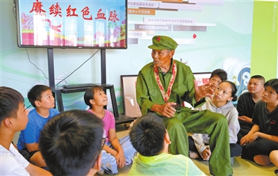 7月31日,在江蘇省海安市墩頭鎮(zhèn)的公益暑托班上,95歲高齡的老兵謝鳳如向?qū)W生們講述紅色故事。周強(qiáng) 丁春梅 攝
