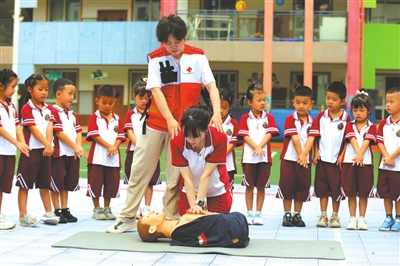 日前,四川省樂山市惠靈幼兒園開展“珍愛生命 預(yù)防溺水”安全教育活動。樂山市市中區(qū)紅十字會應(yīng)急救護(hù)志愿者通過模擬溺水救援等環(huán)節(jié),為教師及幼兒普及防溺水相關(guān)知識,增強(qiáng)幼兒的安全意識,提高幼兒的自救能力。圖為教師在志愿者指導(dǎo)下演示心肺復(fù)蘇。李華時 彭一淇 攝
