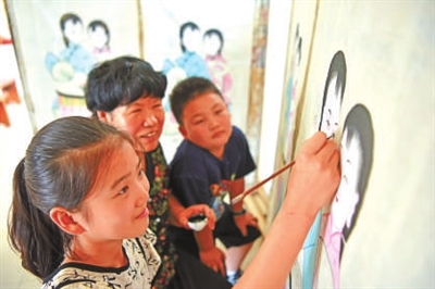 8月1日,在山東省高密市,小朋友在撲灰年畫代表性傳承人王樹花(左二)的指導(dǎo)下學(xué)習(xí)繪制技巧。李海濤 攝