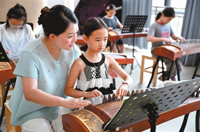 8月11日,在安徽省亳州市青少年活動中心,孩子們在學(xué)習(xí)彈古箏。 劉勤利 攝