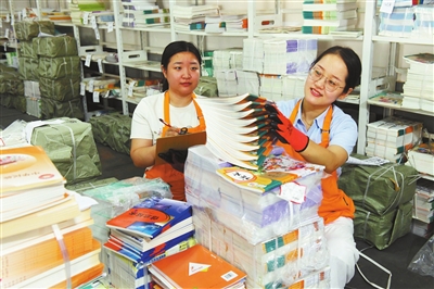 8月12日,工作人員在河北省新樂市新華書店倉庫整理清點(diǎn)中小學(xué)教材,準(zhǔn)備送往各學(xué)校。賈敏杰 攝