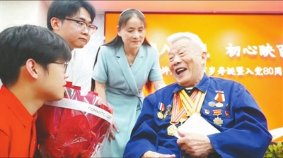 本報訊(記者 王瓊 通訊員 張運 虞璐)“吃菜要吃白菜心,當兵要當新四軍……”今年暑假,抗戰老兵許勝迎來100歲生日。日前,在百歲壽誕上,他激昂高歌,堅定地表示要鞠躬盡瘁,死而后已。這一幕被揚州大學抗戰口述史搶救團隊記錄下來,成為他們搶救民族記憶、傳承抗戰精神的最新實踐成果。