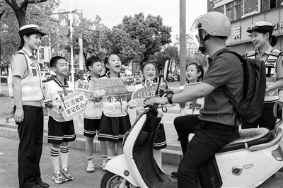 8月13日,在安徽省蕪湖市繁昌區(qū)繁陽鎮(zhèn)五華山路口,“小交警”在交警的帶領(lǐng)下向市民宣傳交通安全知識(shí)。肖本祥 攝