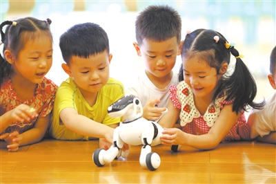 暑假期間,四川省樂山市金蘋果邦泰幼兒園托管班開設人工智能課程活動,孩子們通過對話、握手、行走等互動環節,在趣味體驗中樂享智能科技的魅力,豐富暑假生活。圖為孩子們在與智能機器人互動。李華時 郭琴 攝