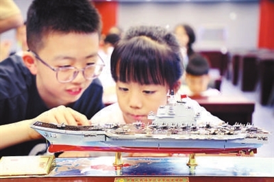 近日,安徽省六安市金安區東市街道淠河社區和安徽省地礦局313地質隊暑期托管班的孩子們觀看航空母艦模型。田凱平 攝