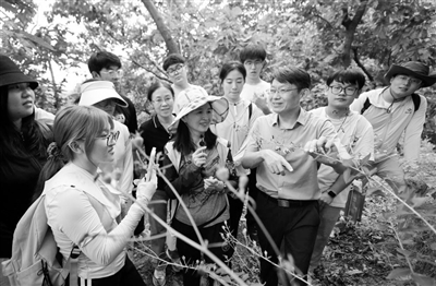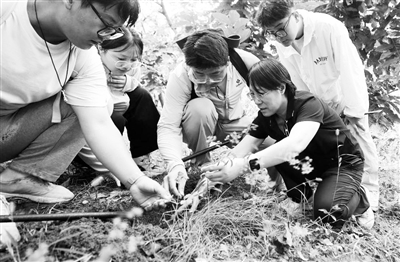 山東中醫藥大學藥學院師生在采集黃芪標本。