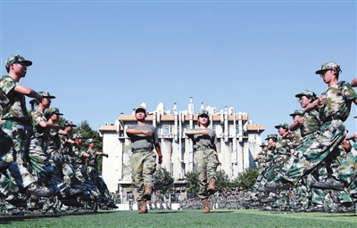 9月15日,湖南省衡陽市,南華大學2025級新生在學校田徑運動場進行正步走項目的訓練。新學期開始,該校面向2025級新生開展為期兩周的軍訓,以此引導新生增強國防觀念,厚植愛國情懷。曹正平 攝