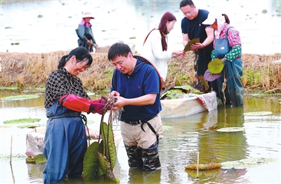 在江蘇省淮安市金湖縣呂良鎮(zhèn)的芡實種植基地,江蘇大學(xué)食品與生物工程學(xué)院教授崔鳳杰(前左二)與基地工作人員一起調(diào)研芡實移植情況。