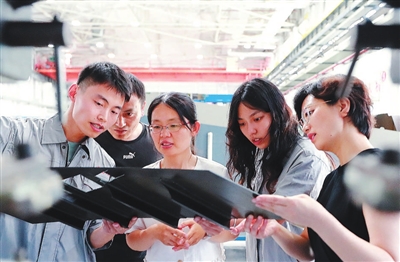 在江蘇航天海鷹公司生產(chǎn)車間,江蘇大學(xué)激光先進制造團隊成員葉云霞教授(右一)了解企業(yè)技術(shù)應(yīng)用情況。