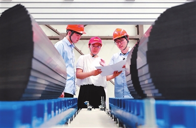 在江蘇大全集團油浸式變壓器總裝車間,江蘇大學(xué)機械工程學(xué)院教授黃娟(中)現(xiàn)場解答企業(yè)生產(chǎn)中遇到的設(shè)計圖紙規(guī)范性問題。
