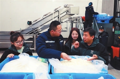 在江蘇蘇芡農(nóng)業(yè)產(chǎn)業(yè)發(fā)展有限公司冷鏈加工車間,崔鳳杰教授(前右一)帶領(lǐng)師生調(diào)研芡實加工情況。