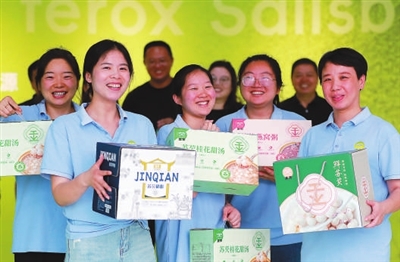 在江蘇蘇芡農(nóng)業(yè)產(chǎn)業(yè)發(fā)展有限公司,女工們展示公司開發(fā)的芡實系列產(chǎn)品。