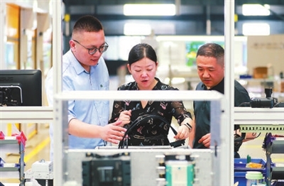 在江蘇大全集團低壓成套電氣生產(chǎn)車間,江蘇大學(xué)計算機科學(xué)與通信工程學(xué)院教師宋雪樺(中)、金華(右)與企業(yè)技術(shù)人員交流基于AI的自動化生產(chǎn)線檢測技術(shù)。
