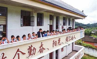近日,臘福小學師生課間在教學樓走廊放松眼睛(無人機照片)。