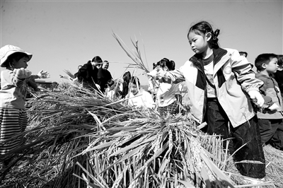 近日,浙江省湖州市吳興區東林鎮保國村東林鎮中心幼兒園的小朋友在體驗拾稻穗。 何偉衛 攝